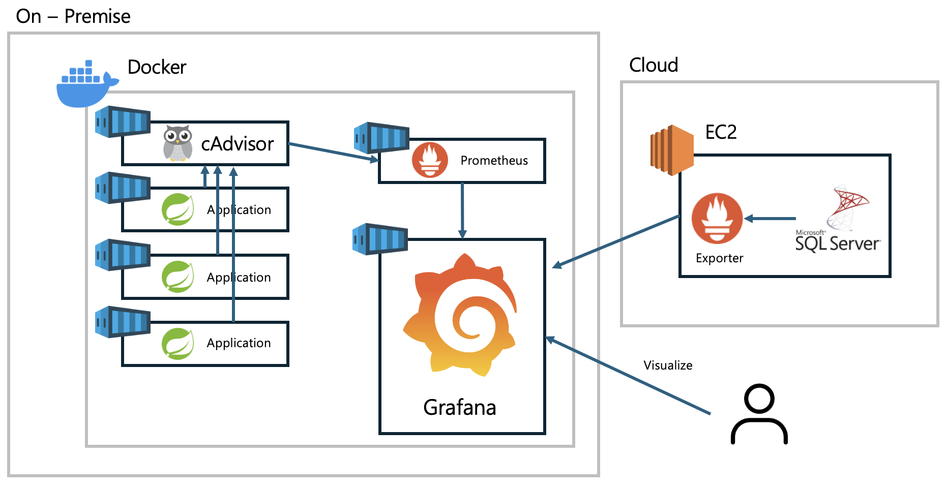 전체적인 데이터 흐름은 다음과 같이 예상된다. 먼저 cAdvisor가 On-Premise 서버 내 컨테이너의 CPU, 메모리, 네트워크 등의 성능 데이터를 수집하고, Windows Exporter가 EC2에서 실행 중인 SQL Server의 성능 메트릭을 수집할 것이다. 수집된 데이터는 Prometheus로 전달되어 저장되며, Grafana가 Prometheus 데이터를 시각화하여 대시보드로 제공할 예정이다. 또한 Prometheus의 Alert Manager를 활용하여 이상 징후 발생 시 알람을 전송하여 즉각적인 대응이 가능하도록 할 계획이다.